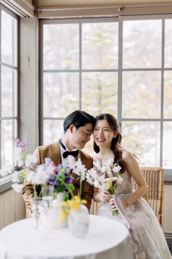 洋館での撮影プランは天候を気にせずご予約いただけるので、おすすめです! 文化財での洋館撮影はお花との相性が最高でした* 洋館は軽井沢から車で1時間の場所となります。 軽井沢での自然ロケーションと組み合わせたプランは3時間撮影プランをお選びくださいませ* 撮影スタートの時は雪が積もって真っ白だったのですが、撮影帰りにはきれいに溶けて何事もなかったよう。。。さすが、3月の雪! 衣装レンタルはブラウンのスーツとドレスレンタルLをご利用いただきまし